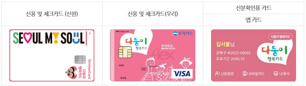 | 신용/체크카드 | 우리카드 홈페이지, 앱 신한카드 홈페이지, 서울지역 신한은행 영업점 |